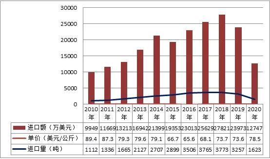 根據(jù)我國海關總署公布的數(shù)據(jù)顯現(xiàn),2020年我國共進口光纖用高純石英管1622.941噸,進口額1.275億美元,與2019年同期相比進口量、進口額減少了一半。進口價格約78.5美元/公斤,較2019年提高了6.7%。