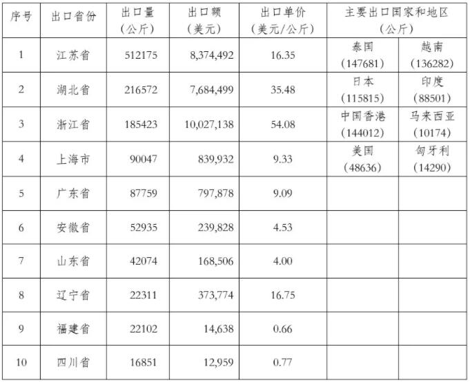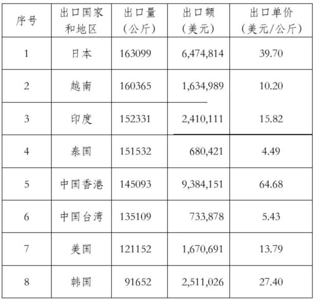 在出口國家和地區(qū)中,我國出口到日本的量最大,為163.099噸,出口額647萬美元。到越南的出口量與日本的出口量非常接近。各出口國家和地區(qū)的狀況如表1所示。